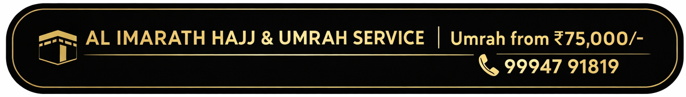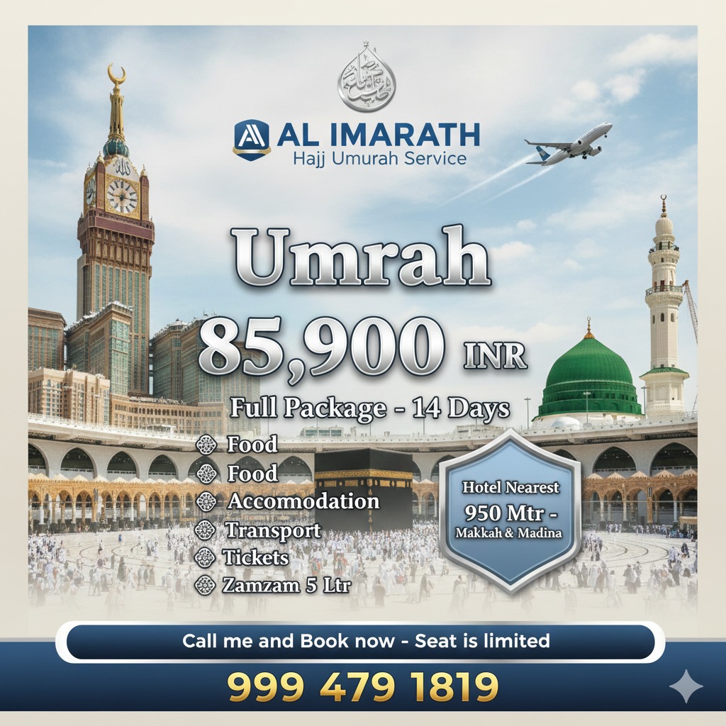 கண்ணியமிக்க அல்லாஹ்வின் நல்லடியார்களே இன்ஷா அல்லாஹ் வரக்கூடிய July மாதம் 14 நாட்கள் கொண்ட உம்ரா பயணம் சென்னை மற்றும் பெங்களூரில் இருந்து விமானம் மூலம் மக்காவில் 10 நாட்கள் மற்றும் மதினாவில் நான்கு நாட்கள் தங்கி பல நல்ல அமல்களை செய்யக்கூடிய வாய்ப்பினை நமது அல் இமாரத் ஹஜ் உம்ரா சர்வீஸ் Alhaj Hafiz முகம்மது அஹமத் அவர்கள் தரப்பில் ஏழை எளிய மக்களும் காஃபாவில் பல நல்ல அமல்களை புரிய குறைந்த விலையில் ஹரமுக்கு அருகாமையில் தங்குமிடம், தமிழக அறுசுவை உணவு, expert உலமாவின் வழிகாட்டி சிறப்பாக செய்து வருவதை தாங்கள் அனைவரும் அறிவீர்.